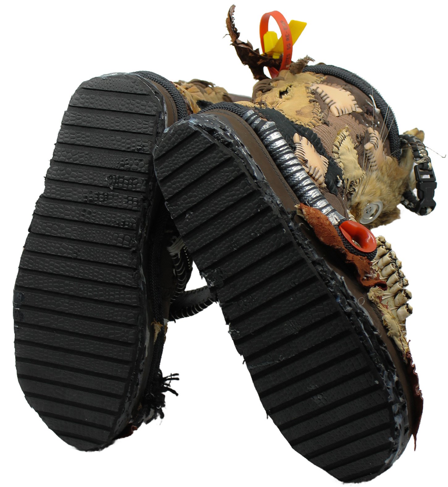 Featuring taxidermy rabbit fur and deer jaw, spray painted war graphic by @eaturshit patch, antique 1940’s child’s boxing glove fronts, climbing rope tie-in loop sides, and triple stacked EVA foam soles. Honestly countless details.